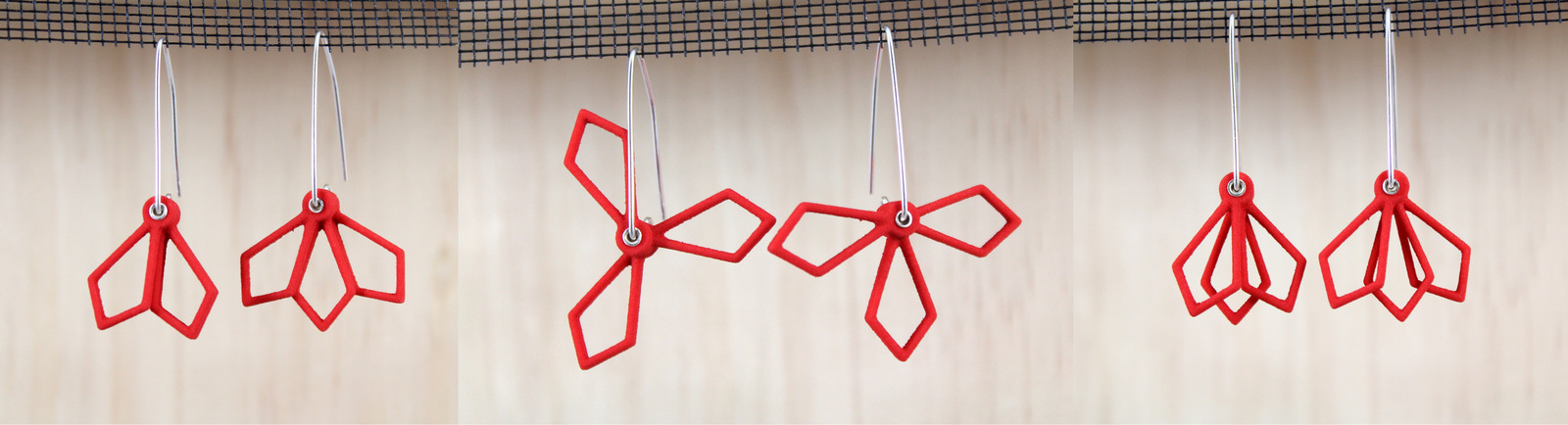 These are kinetic Earrings made of three layers of triangles. You can rotate each layer and create varying designs as shown in the photos.